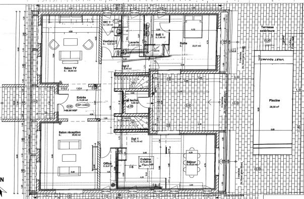 Au rez-de-chaussée : une entrée galerie avec escalier "à double révolution" et ouvrant sur un patio côté piscine, un vestiaire et des toilettes invités, une pièce dite salon TV, un salon de réception, une cuisine dite américaine, aménagée et équipée avec office ouvrant sur un espace salle à manger donnant sur terrasse et piscine, une partie dégagement desservant une suite (ouvrant sur terrasse et piscine) avec salle d’eau attenante et une pièce buanderie/lingerie.